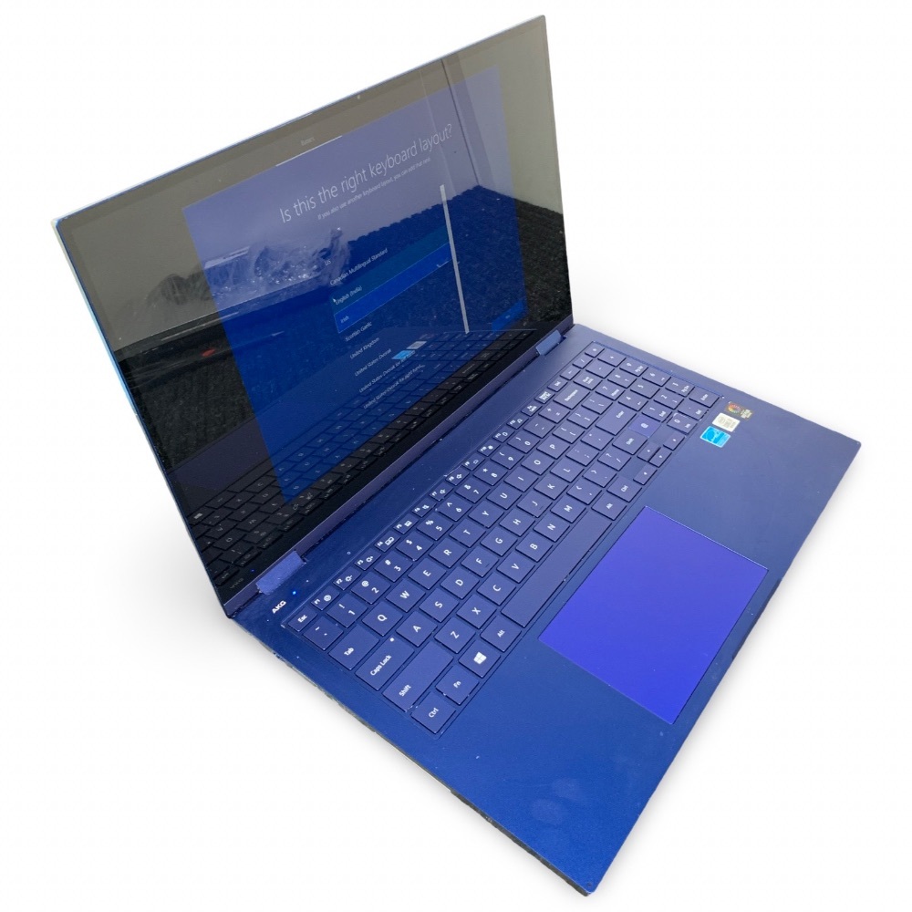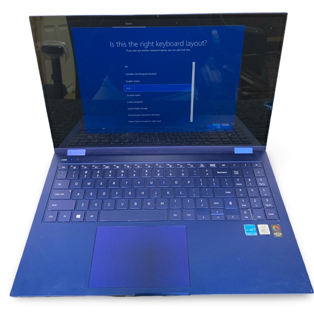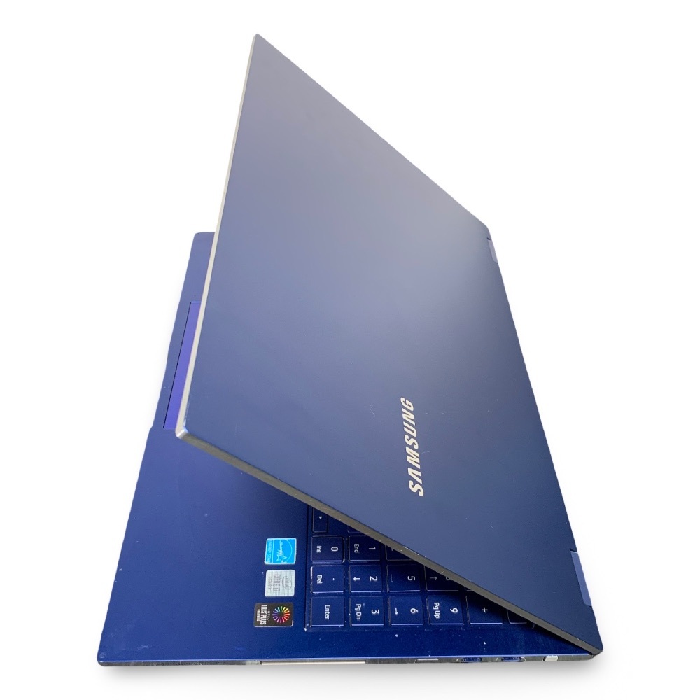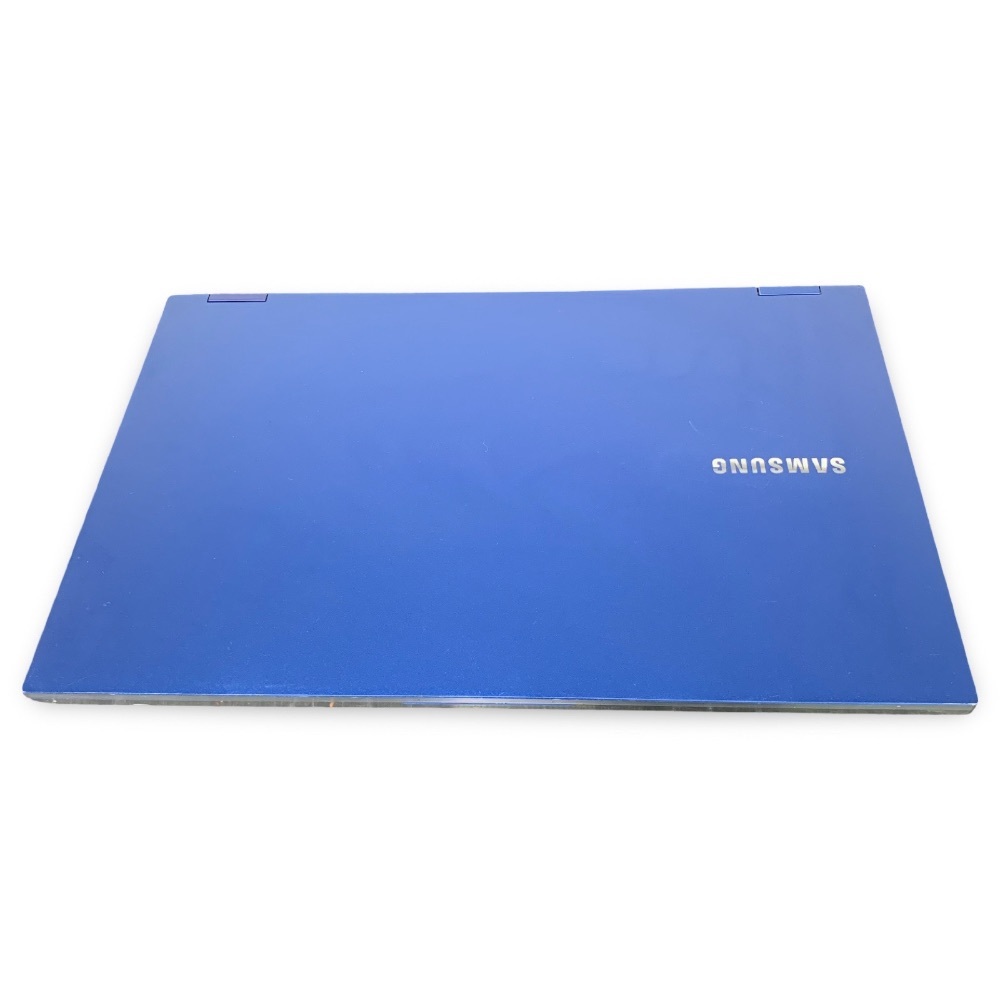 Samsung NP950QCG Galaxy Flex 15.6" laptop in used condition, color Blue. Features an Intel Core i7 1.30GHz processor, 12GB RAM, and 500GB hard drive. No charger included. Laptop shows normal signs of use but is fully functional.
