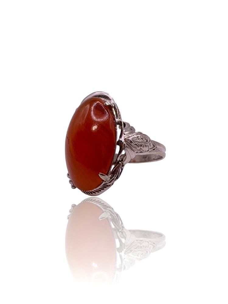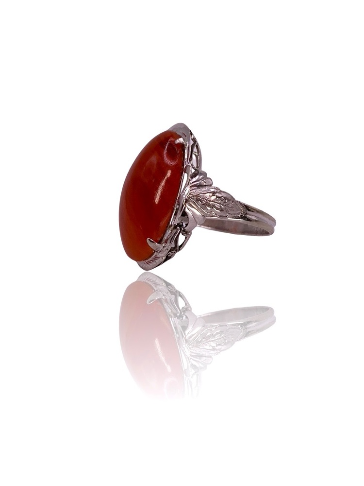 Size 8 – Resizing Available– 3.16 DWT (4.91g) 14KT White Gold Ladies’ Ring – Vintage Style w/ Coral-Like Orange/Red Oval Stone