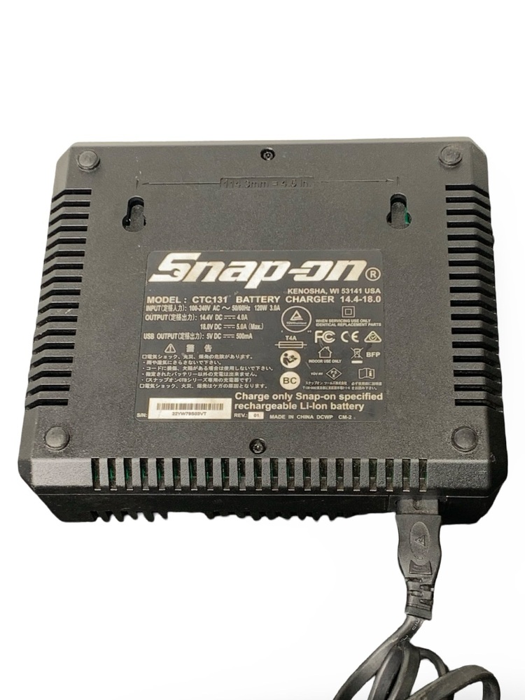 Snap-On CTC131 Dual Bay Battery Charger, used condition. Compatible with both 14.4V and 18V Snap-On batteries. Comes with cord.