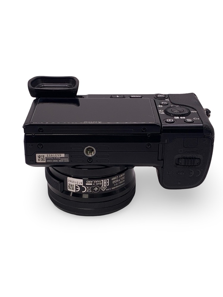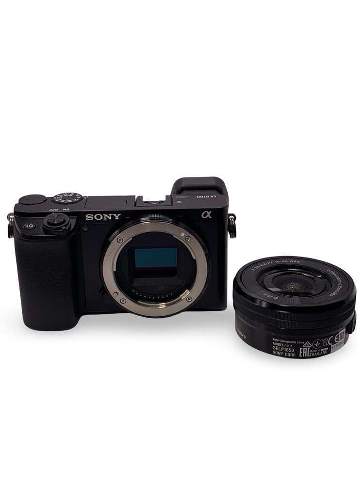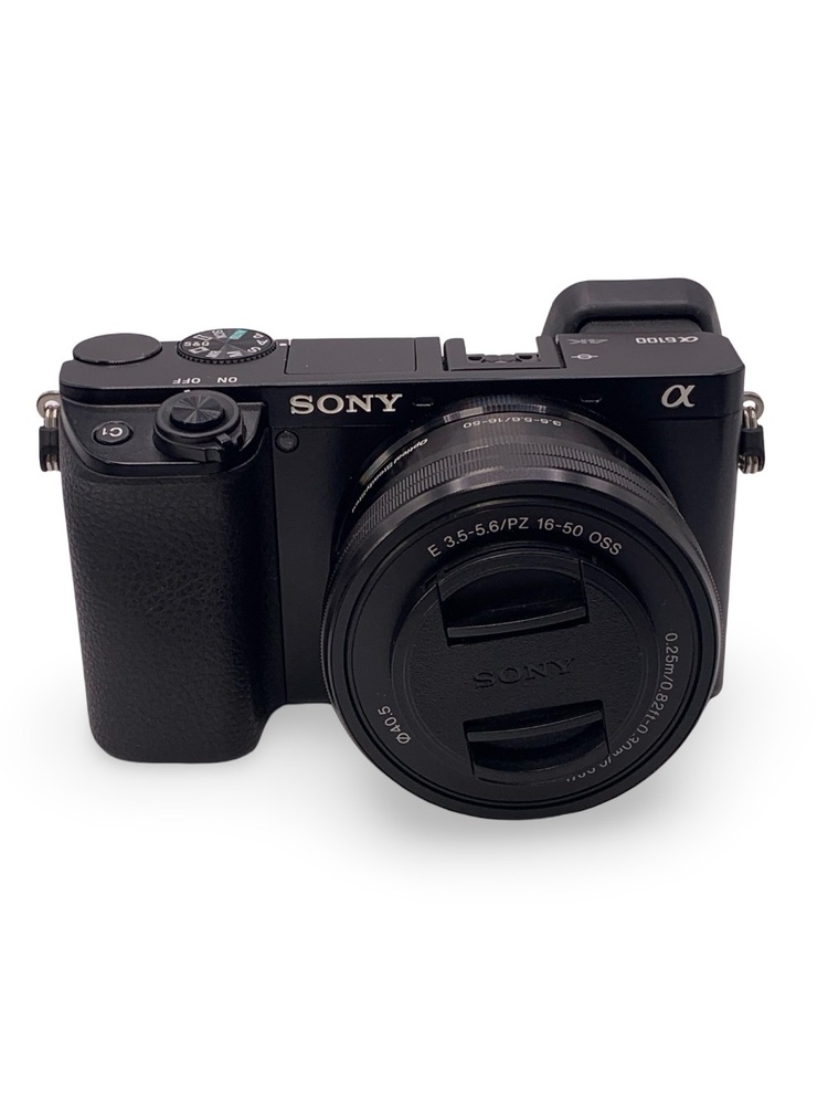 This Sony A6100 camera kit is in used condition and includes everything needed to start shooting. Camera body shows normal signs of use but functions properly. The Sony SELP1650 16-50mm lens is also used and in good working condition.